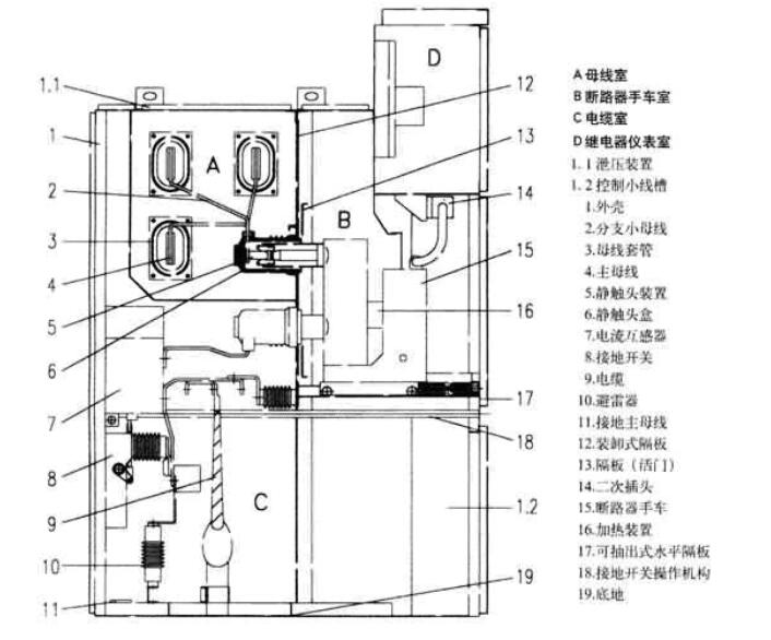 開關設備采用中置式,因而電纜室空間較大,電流互感器、接地開關裝在隔室的后壁上,